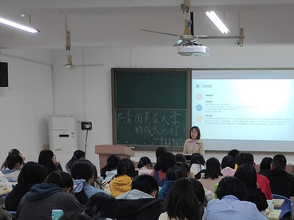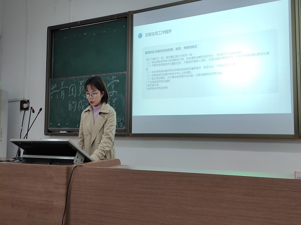 在主持人路娜介绍此次出席嘉宾后,主讲人张凤以共青团员在大学中的成长历程为主题,分别从专业辅修、奖助学金申请、保研推优以及团员入党四个方面细谈。在专业辅修方面,张凤解释了什么是专业辅修,并详细讲解了专业辅修开放的时间、对象及课程。她鼓励学有余力的团校学员结合自身爱好合理选择辅修课程。其后,张凤分析了国家奖学金、国家助学金及国家励志奖学金的申请条件、申请时间及申请对象,呼吁符合条件的学员积极申请。就保研推优方面,张凤提到,保研推优分为学科推优和专业推优,是国家一项重点人才筛选项目,旨在推荐优秀本科生免试攻读研究生,她提到,学员们可根据自身条件进行申请。最后,张凤对团员入党的四个阶段进行了着重分析,完善团校学员对党的认识。