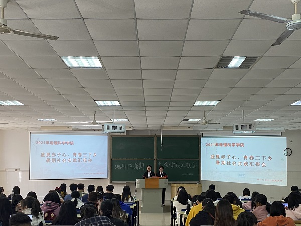 (通讯员 楼晴娱 颜福兴)11月8日中午,2021年地理科学学院 “盛夏赤子心,青春三下乡”暑期社会实践成果汇报会在景德楼204教室召开。出席此次汇报会的嘉宾有院党委副书记陈媛、学工办老师陈胜冲、学工办老师张凤、四大系统各主要负责人以及各兄弟学院的代表。