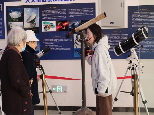 地理科学学院党委副书记陈媛和学工办老师陈胜冲带领退休老教师和社团同学一起参观地学博物馆和天文馆。陈媛问候了参与活动的老师、同学并简要介绍了学院两馆的历史。通过解说员的讲解和引导,大家对地学博物馆内的展品有了大致的了解。退休老教师就馆内古生物化石的陈列提出了相关建议。老师、同学们参观了天文馆,学习到了许多天文学知识,观赏了各种天文望远镜。活动过程中,老教师们与同学们进行了深入交流。