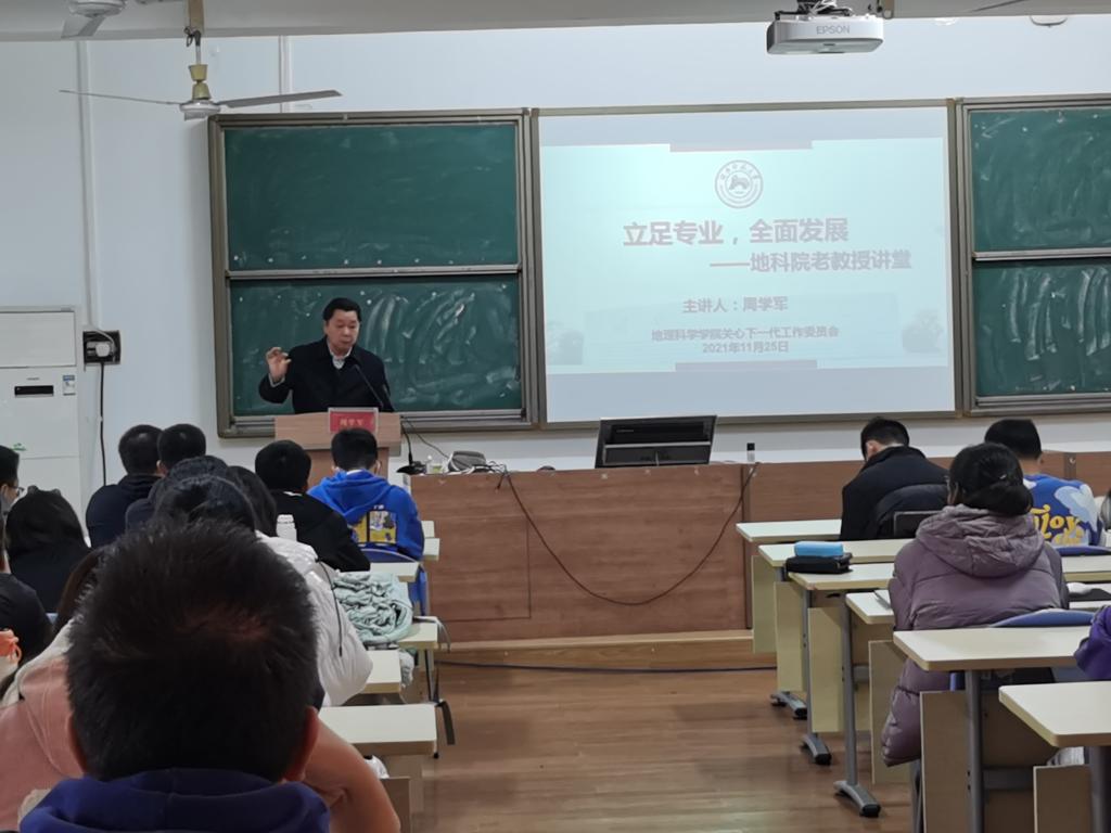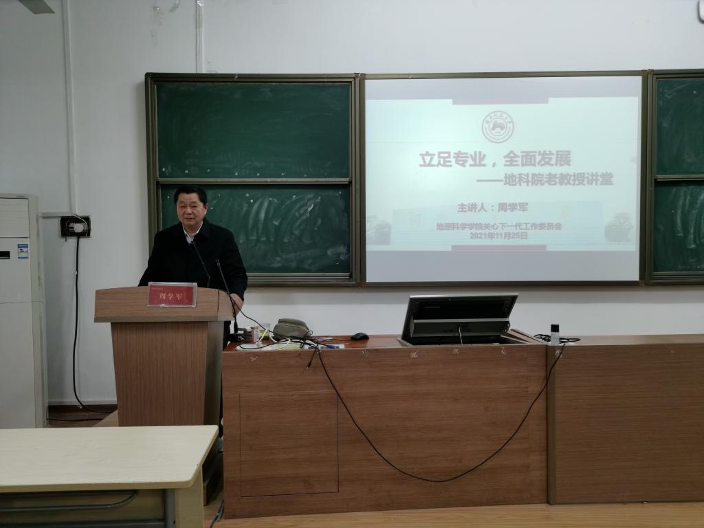 (通讯员 许红)11月25日下午,我院关工委顺利开展以“立足专业,全面发展”为主题的老教授讲堂暨新生教育讲座,老教授周学军担任主讲嘉宾。我院党委副书记陈媛、关工委常务副主任周英参加讲座,讲座由学工办辅导员陈胜冲主持。