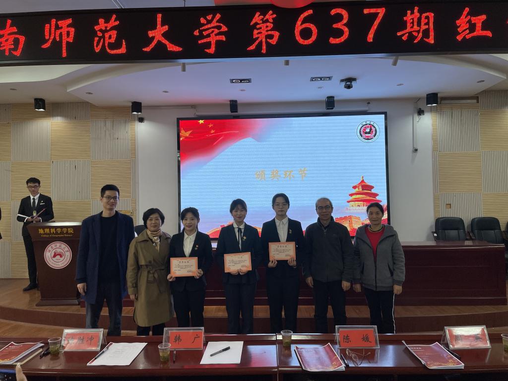(通讯员 何建玲 崔丹丹 柳惠文)11月29日中午,地理科学学院第637期红色论坛主题活动“重温百年奋斗历程,展现青年时代担当”在地理科学学院301报告厅成功举行。出席此次活动的嘉宾有:地科院党委副书记陈媛老师,地科院创新训练中心兼地理科学专业老师韩广教授,地科院关工委常务副主任周英老师,学工办杨惠君老师,学工办陈胜冲老师。