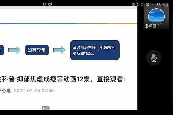 会议伊始,主持人张淑贤对各位积极参与的朋辈心理辅导员表示欢迎,并介绍了本次会议的主讲人。随后卢健老师介绍了当代大学生多样化的压力来源途径,并具体分析压力与人体健康的密切关系。围绕大学生因压力过大导致心理危机这一问题,他表示大学生心理危机预警网络建设至关重要,并强调朋辈心理辅导员作为其中关键一环的意义所在。随后他详细阐述了朋辈心理辅导员的定位与功能,作为同学成长中的同行者与陪伴者,朋辈心理辅导员这一身份具有特殊的存在使命。卢健老师还从朋辈心理辅导员的角度出发,介绍其必备技能,并分享了许多大学生常见的心理问题,其中他深入分析了抑郁症这一在大学生群体内发病率高且易被忽视的病症,并提醒朋辈心理辅导员引起对抑郁症的重视。最后他分享了有关抑郁症的科普动画,并鼓励朋辈心理辅导员积极关注同学心理动态,针对异常情况及时向班主任、年级辅导员反映,争做一名合格负责的朋辈心理辅导员。