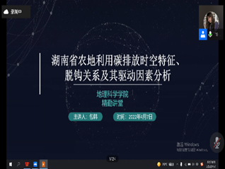 通讯员(邓婷月 劳显岚)4月7日中午,地理科学学院(以下简称“地科院”)团委青年创新创业指导中心于线上腾讯会议举办了以“湖南省农地利用碳排放时空特征、脱钩关系及其驱动因素研究”为主题的精勤讲堂活动。地科院共190名本科生参加此次活动。