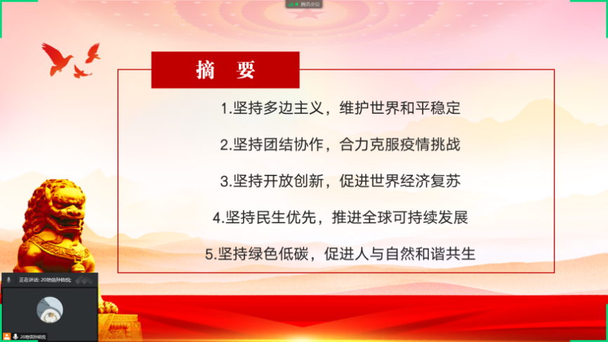 (通讯员 孙铭悦 李思琪 毛颖婕)12月6日,地理科学学院2020级青马学习小组二组以线上腾讯会议的形式开展了关于《习近平谈治国理政》线上学习活动,由组长孙铭悦担任主持人。
