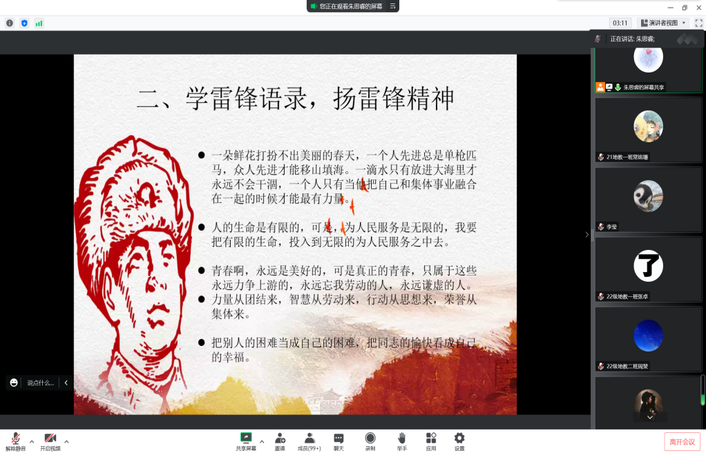 (通讯员 姚欣彤 蒋曦)每年的3月5日是学雷锋纪念日。当晚,地科院团委青年志愿者工作部通过腾讯会议开展了“学雷锋纪念日”学习活动,号召大家继承并发扬雷锋精神。