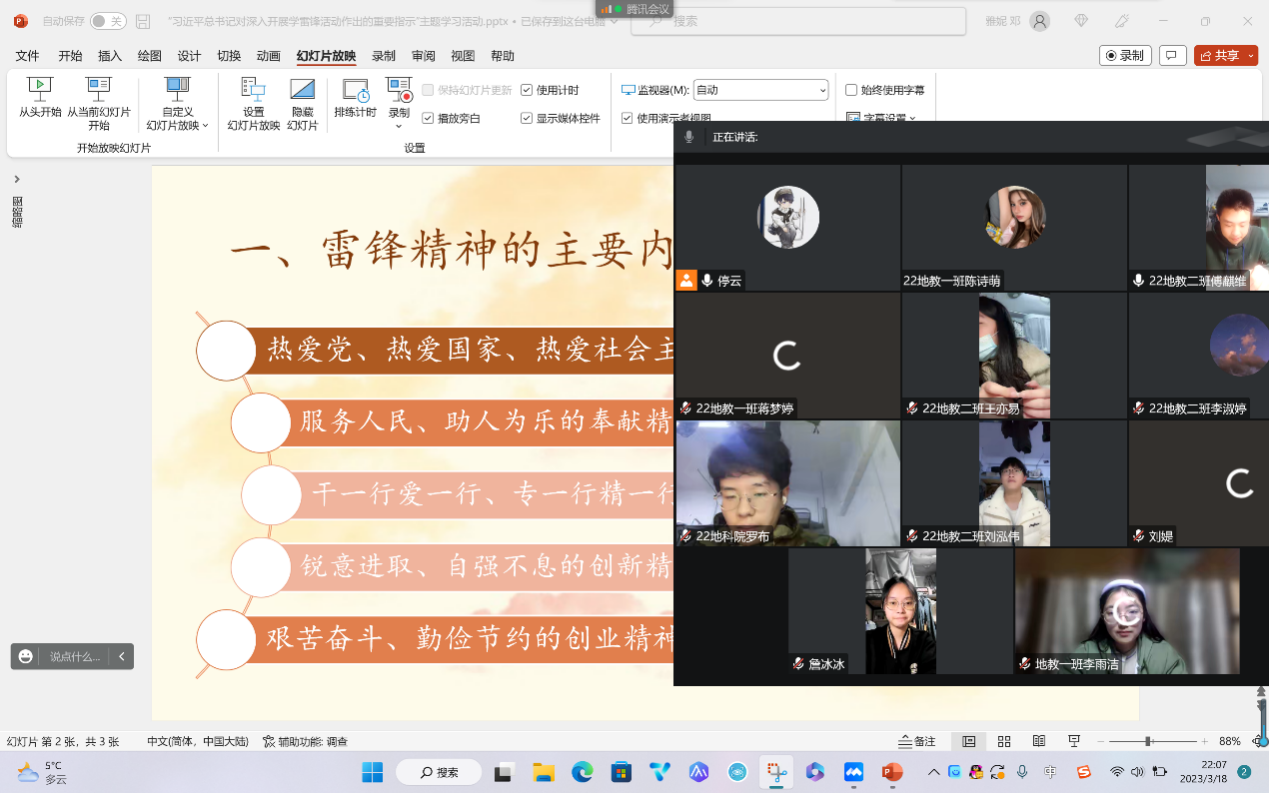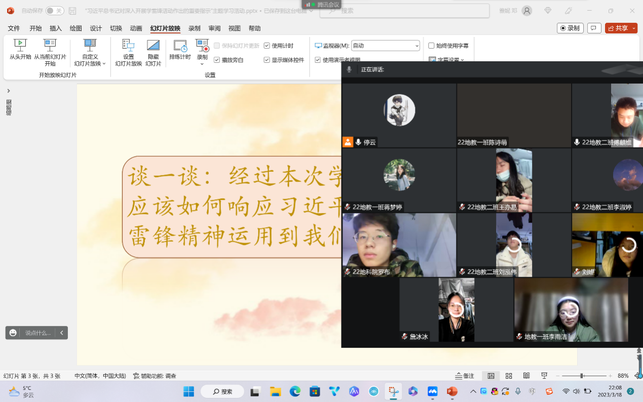 (通讯员 邓雅妮 罗布 刘智超)3月19日上午,地理科学学院青马小组六组在腾讯会议上以线上会议的形式开展了“习近平总书记对深入开展学雷锋活动作出的重要指示”主题学习活动。此次会议由地科院青马小组六组组长邓雅妮主持,地科院青马小组六组全体成员参与。