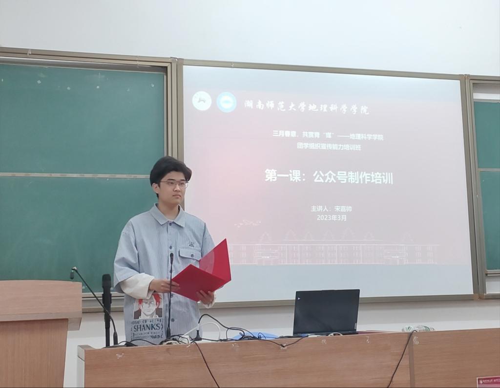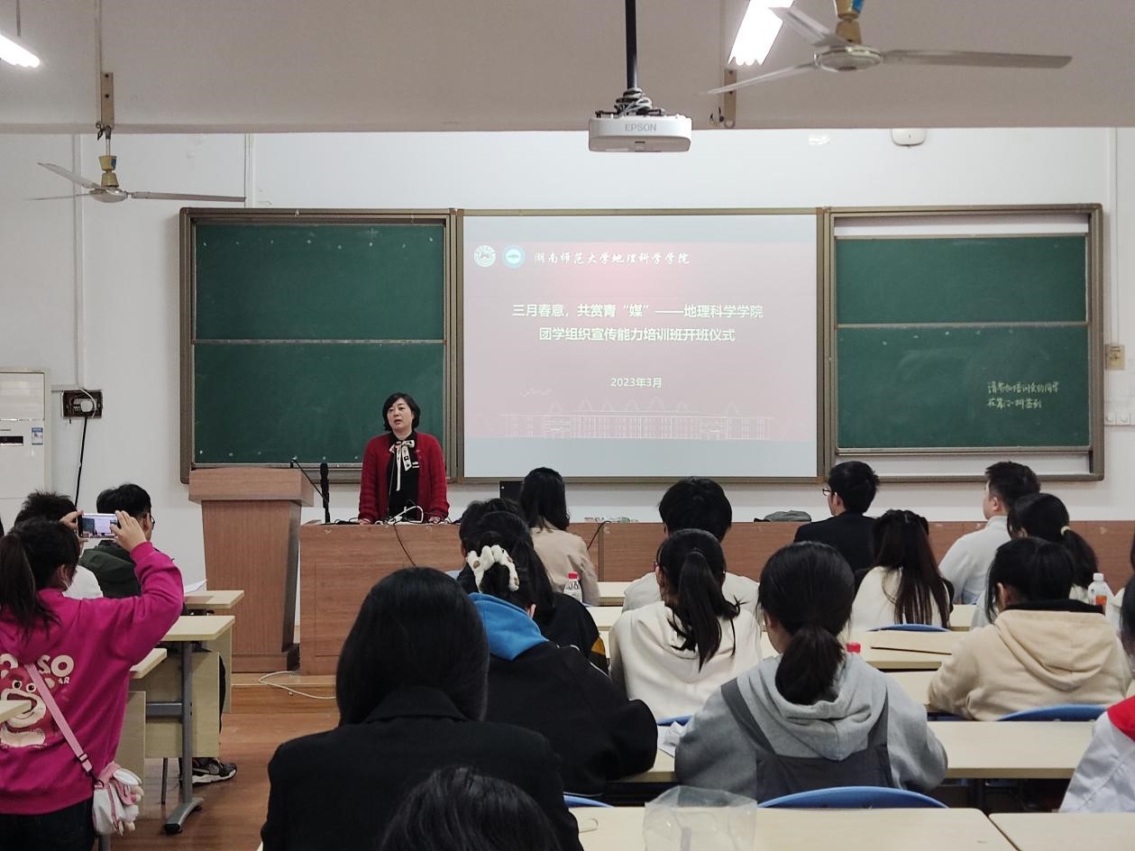 (通讯员 肖紫颖 彭蕾 周文慧)3月16日下午14:00,地理科学学院(以下简称“地科院”) 青年传媒中心于经纬楼227举办“三月春意,共赏青‘媒’”团学组织宣传能力培训班开班仪式暨培训班第一讲“融媒体时代下如何做好新媒体运营”。学院党委副书记陈媛、学工办主任郑楠、学院团委负责人杨惠君、学工办张凤、熊永欣出席此次活动,地科院团学组织部分学生参加此次活动。