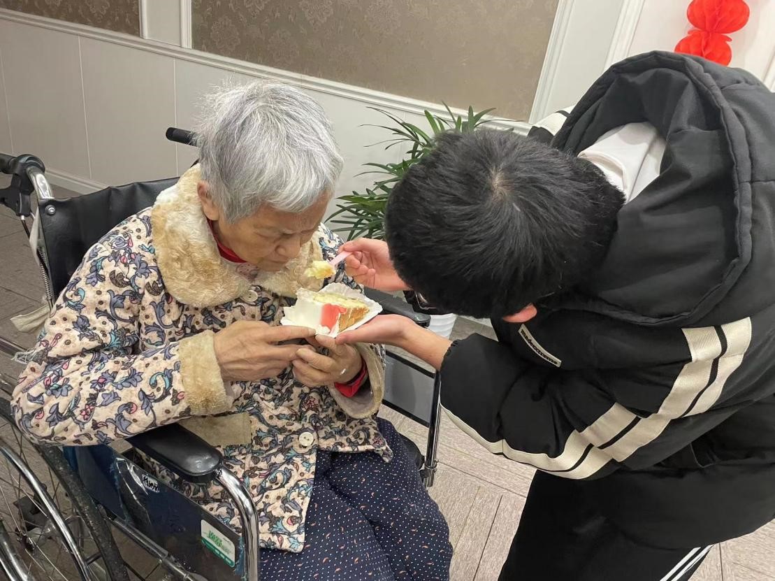 志愿者给老人喂蛋糕