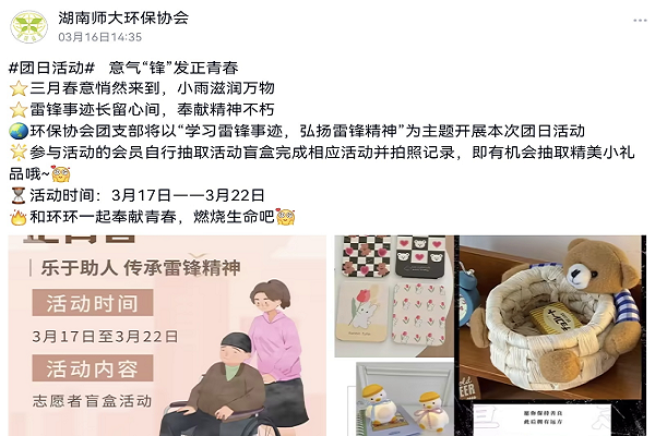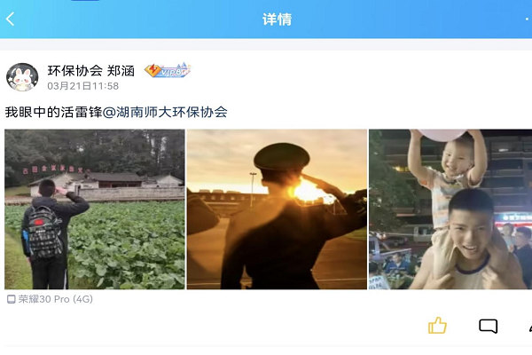 (通讯员 欧阳旺 童欣 王婷玉)3月17日至3月31日,地理科学学院环保协会团支部开展线上“学习雷锋事迹,弘扬雷锋精神”主题团日活动,社团部分会员参与。