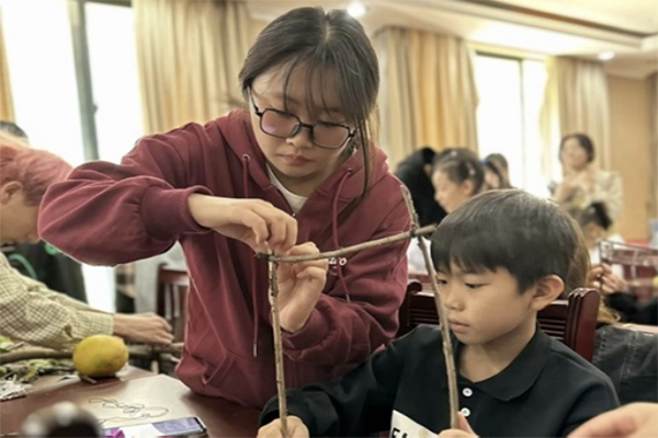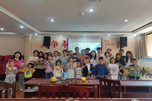 科普课堂中,主持人以问答的形式引导小朋友进入学习,小朋友们踊跃回答问题,积极参与课堂活动。通过展示多种树叶的图片,主持人向小朋友介绍了树叶种类,并讲解落叶形成的原因。宣讲结束后,志愿者带领小朋友在麓枫社区内收集落叶,观察各种自然现象,让小朋友初步认识到了植物的多样性。在志愿者一对一的协助下,小朋友们利用收集到的自然材料完成了手工品的制作。