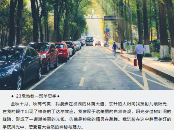此次图文分享活动以线上形式面向全体地科院学生进行征稿,分为“触景生情”和“追忆往昔”两个主题,同学们以照片和文案组合的形式积极投稿。征稿截止后,地科院青传青评部与期刊部工作人员进行稿件评选,并制作了活动推送对部分优秀作品进行展示。