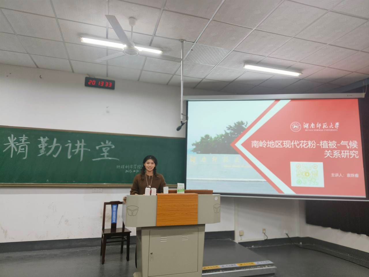 此次活动的主讲人为地科院2021级地理科学专业学生袁姝睿。袁姝睿认为在当代大学教育的环境下,大学生创新创业竞赛是学习中的一条重要的赛道。她从大创流程入手,以“南岭地区现代花粉-植被-气候关系研究”为主题开展具体讲解。袁姝睿从竞赛和项目的研究背景及意义,到研究的具体内容及创新方面做了学术经验分享。在分享中,她还补充了“未来教育家”比赛相关内容,帮助同学们更好地着手定位未来学习方向。在现场问答交流环节中,袁姝睿对同学们提出的如何入手确定项目课题及如何与老师联系沟通等问题进行了详细解答,建议有参赛意向的同学与经验丰富的老师交流,积极参与项目制课程,并从中获得经验的积累。