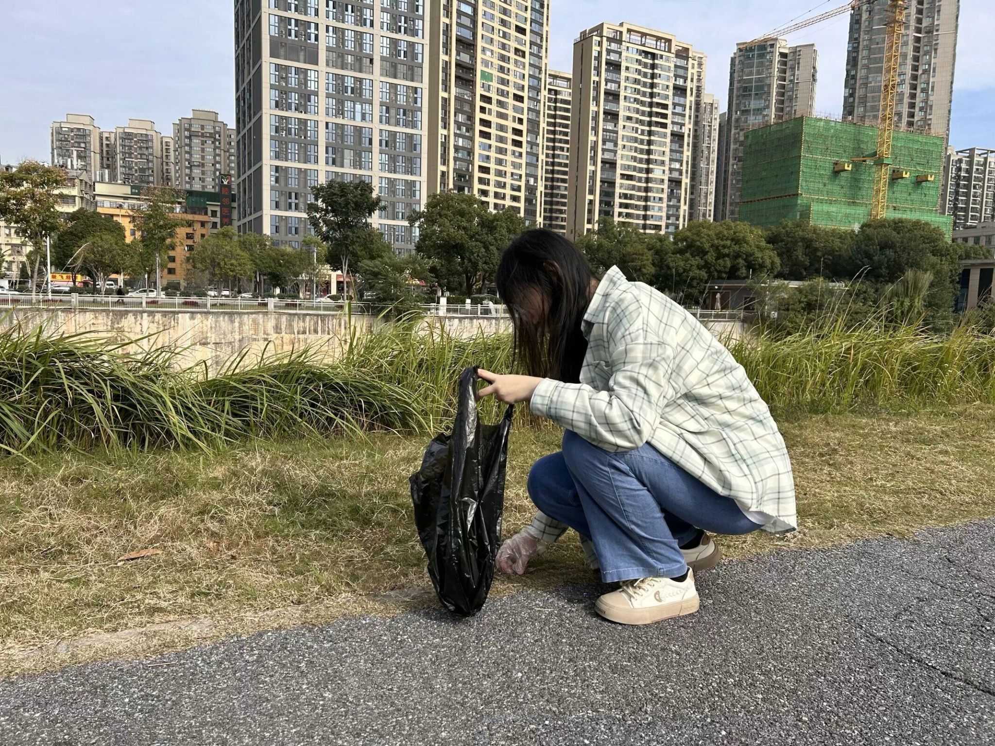 志愿者捡起地上的垃圾
