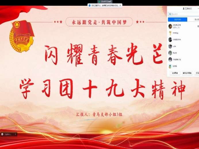 此次活动分为两次进行。上午,小组成员于线上学习了团的十九大相关知识。杨梦晴为大家介绍了“团的十九大”的背景与内容概要,深入解读其核心价值和使命。小组成员们积极发言,分享对团的十九大精神的理解和个人感悟。他们表示,经过学习,不仅更加深刻地认识到了作为当代中国青年的光荣与责任,而且更加坚信团的十九大精神将激励他们为国家和民族的未来贡献更多的力量。
