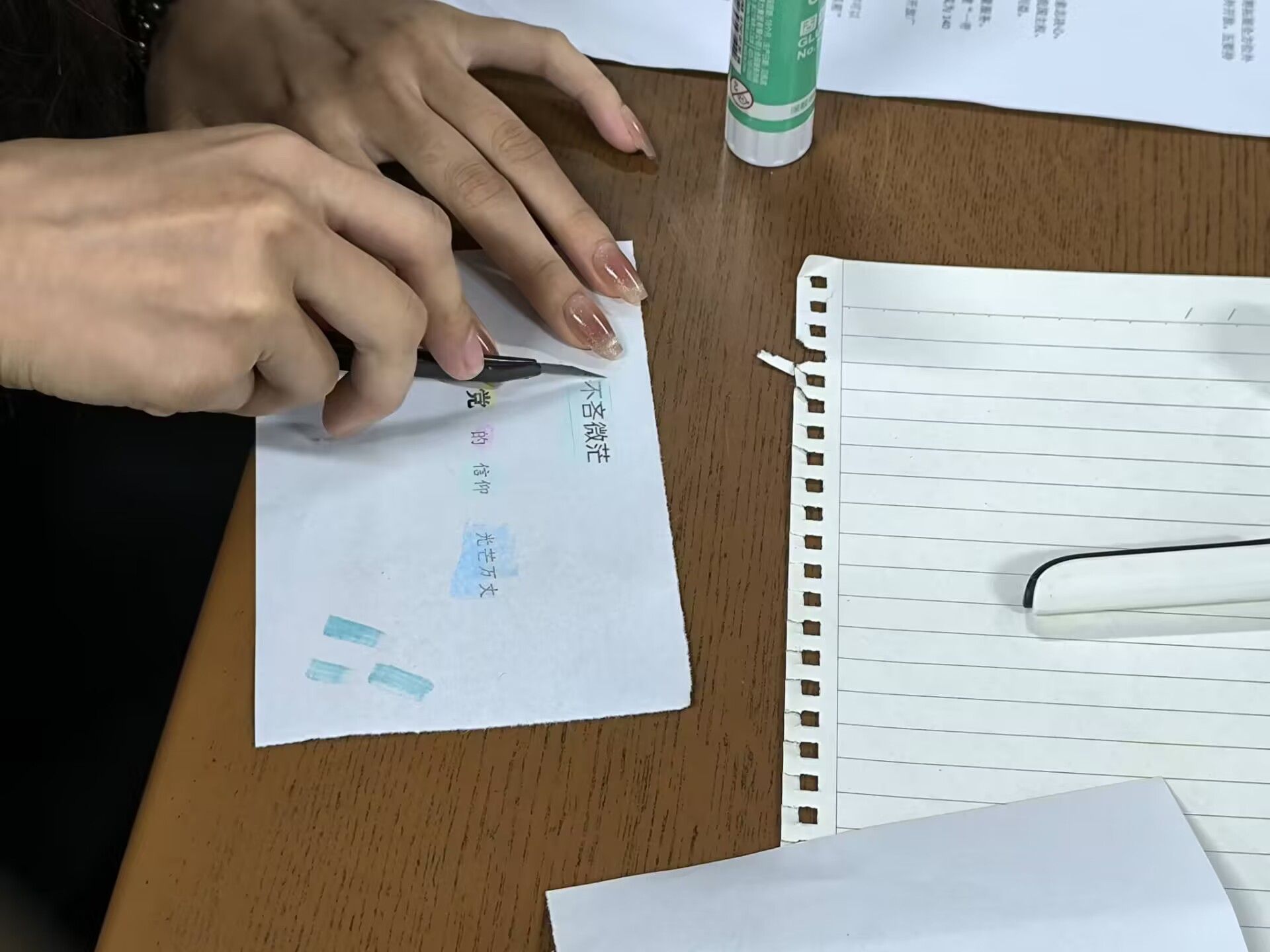 活动上,许卓向小组成员介绍共青团的十九大背景,并组织小组成员讨论团十九大的主题精神的内涵。在学习过程中,小组成员分组讨论,讲述了自己对于团十九大精神内涵的认识,分享了如何将该精神运用于日常生活中的做法。为了更深层次了解团的十九大内涵,小组成员开展拼贴诗活动。小组成员们各司其职,提取与团十九大精神有关的词汇,合力完成了诗词的裁剪以及拼贴。