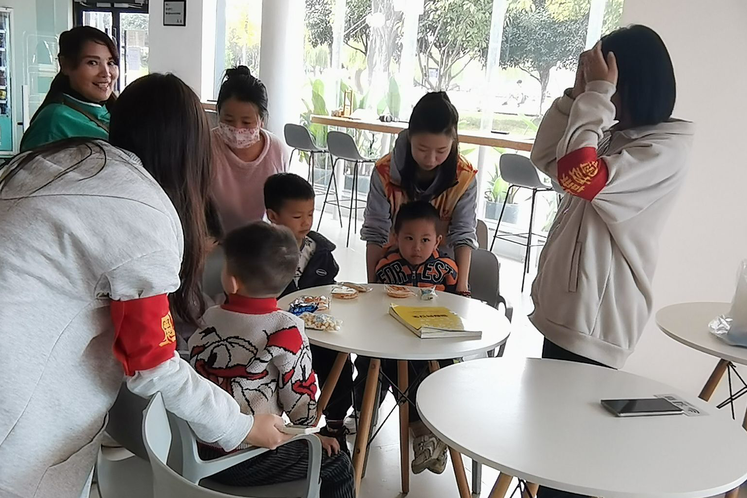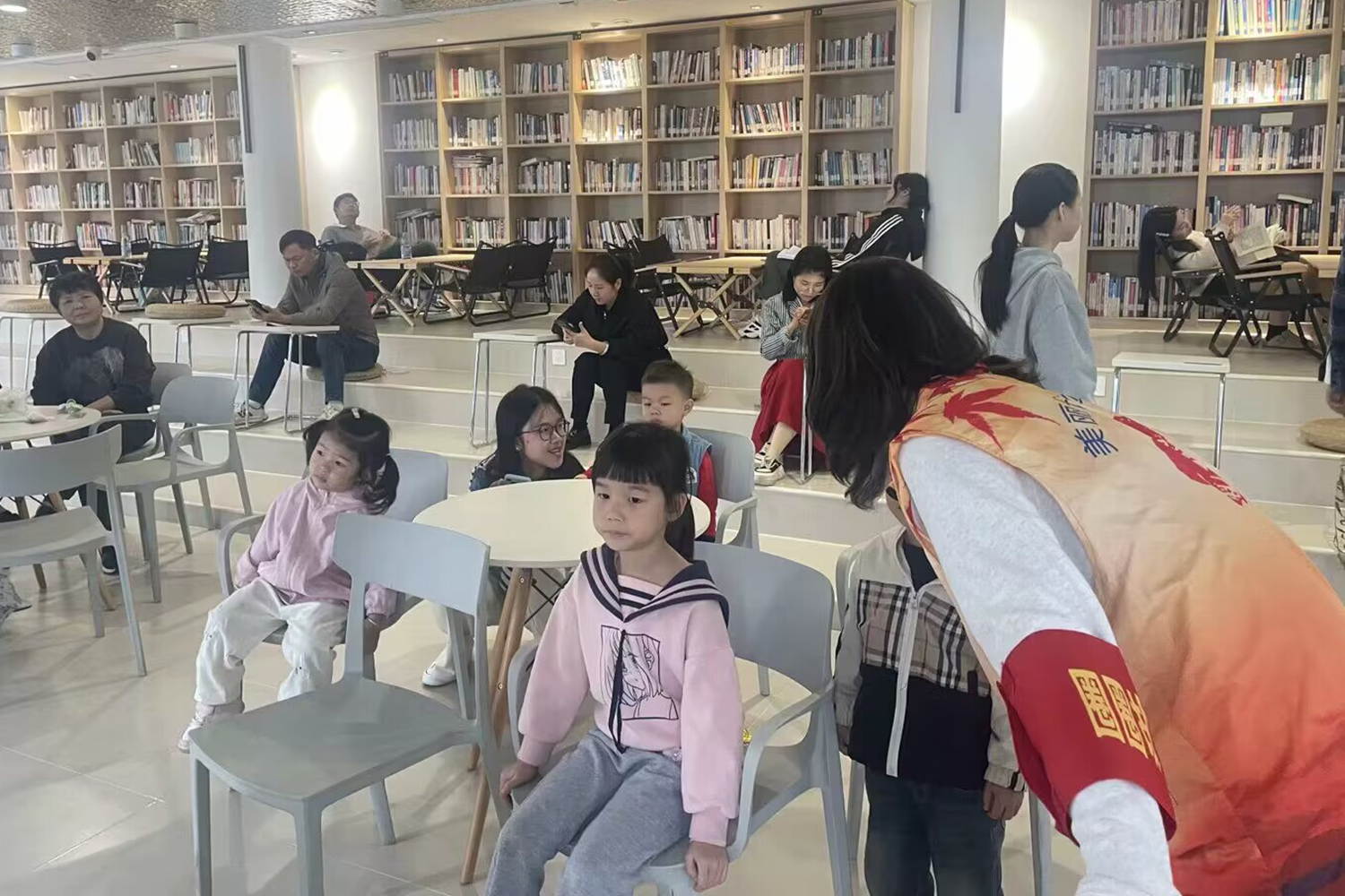 图为活动开始前,志愿者邀请孩子们进入书屋参与此次活动,并安排家长们有序签到入座。