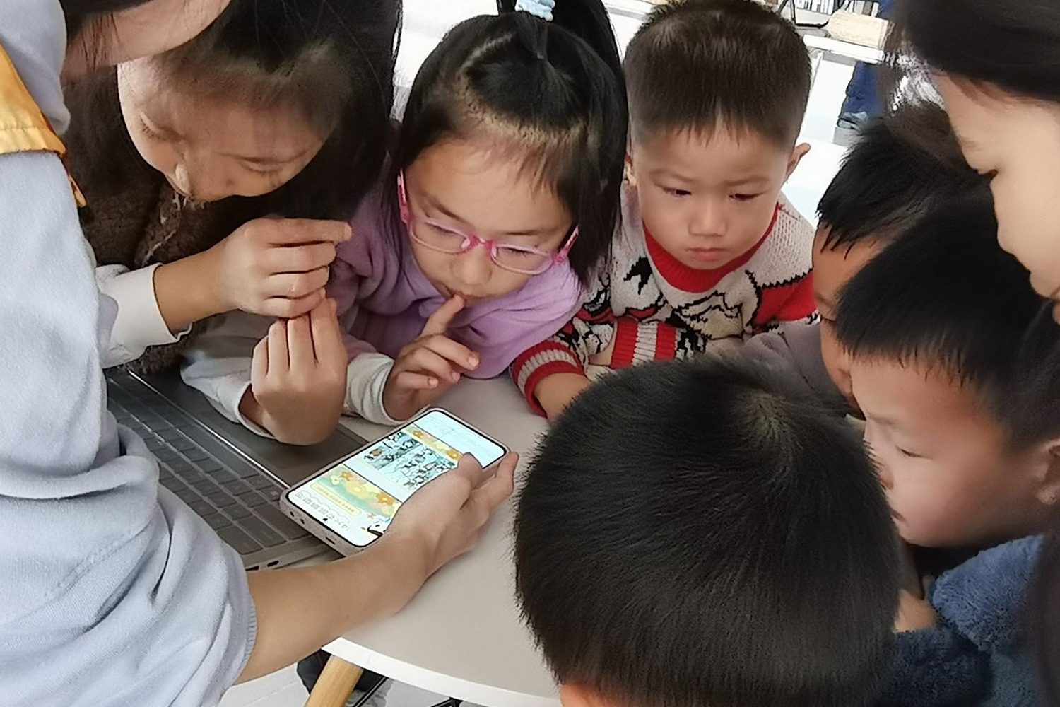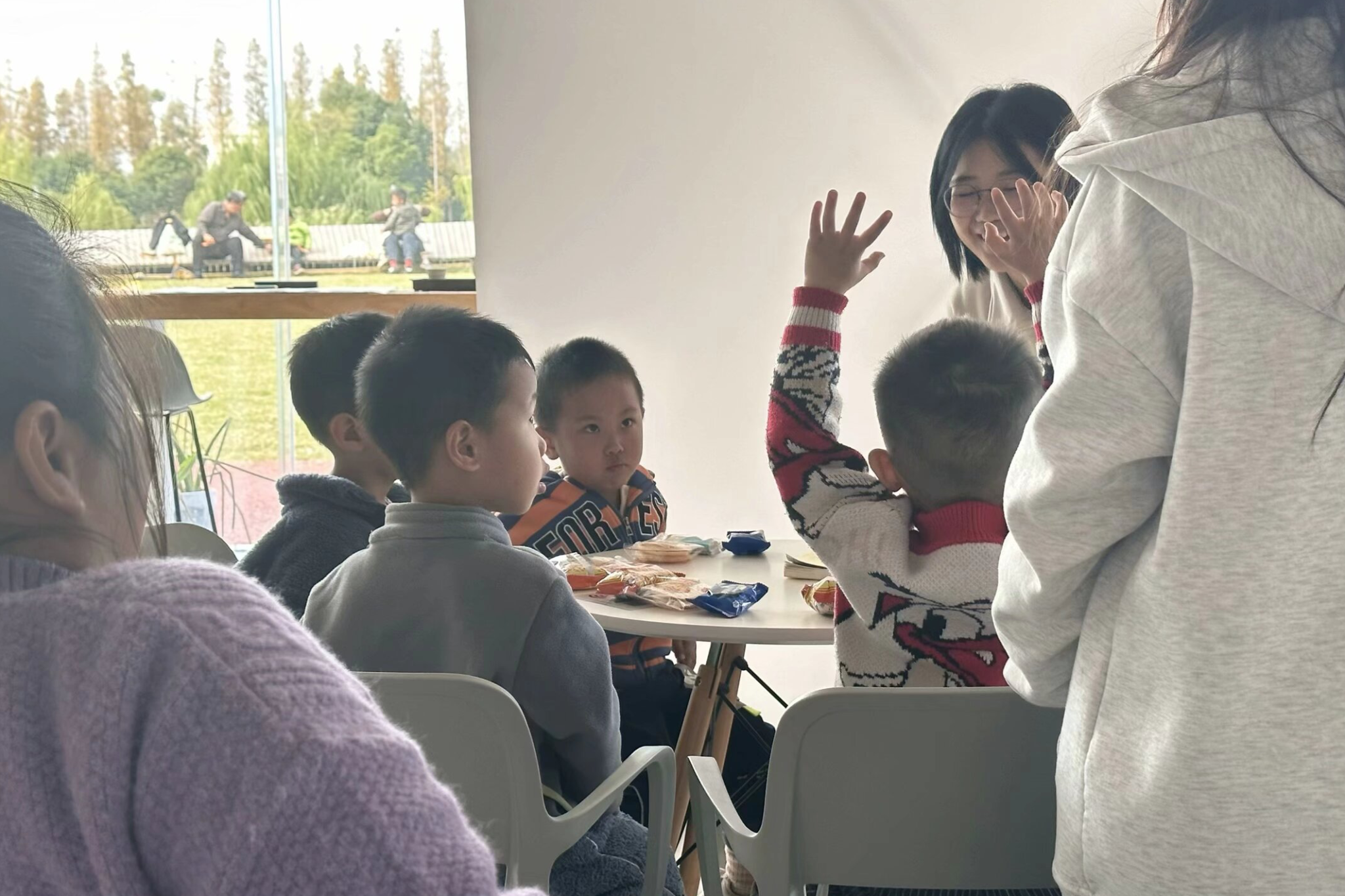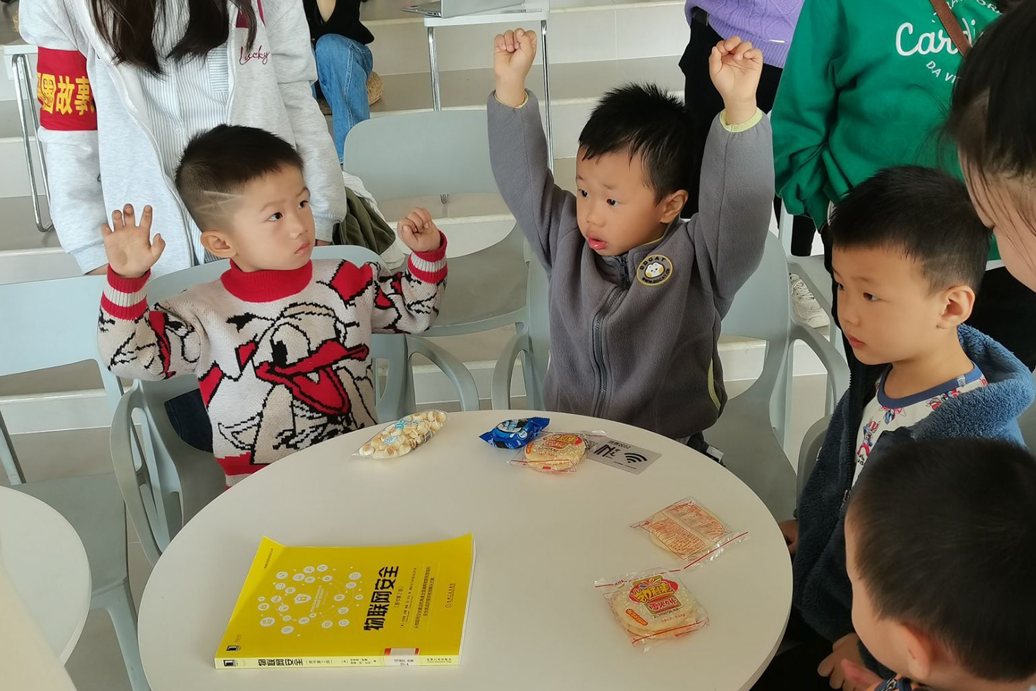 图为小读者们开展反应力小游戏“大雨小雨”,在游戏中锻炼孩子们的认知能力和反应能力。