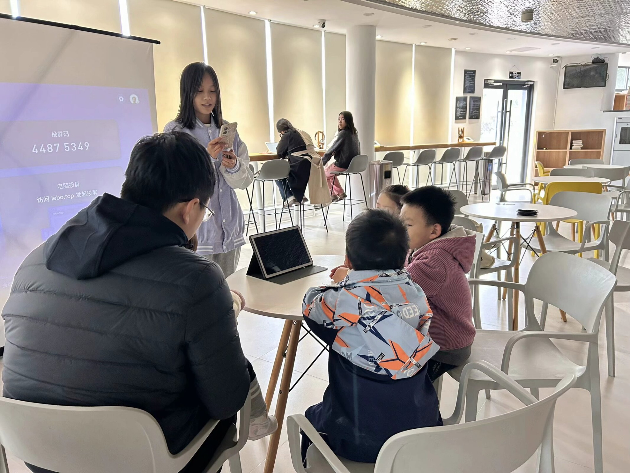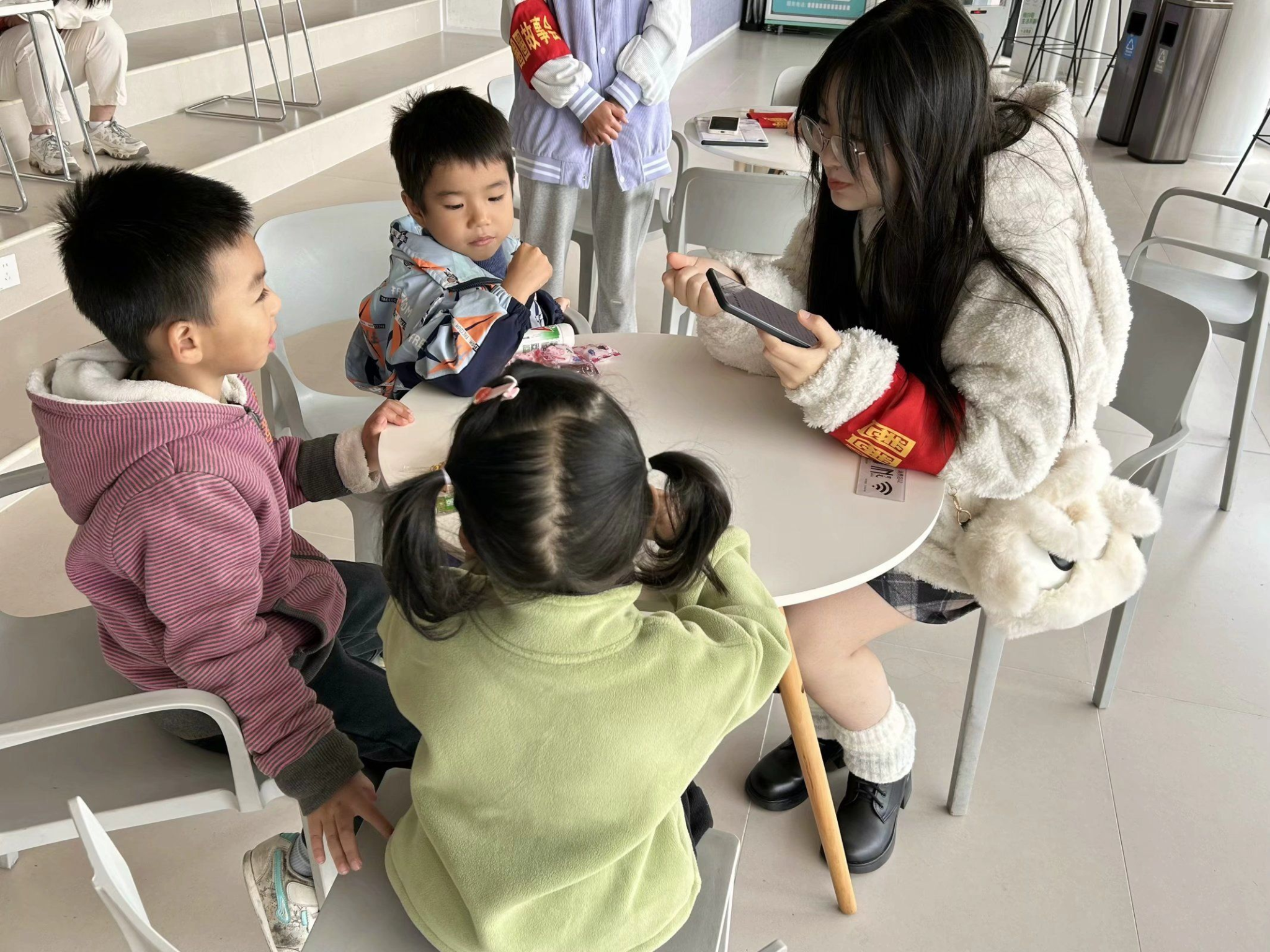 图为志愿者和小读者们一起开展益智小游戏——“脑筋急转弯”,在游戏中锻炼孩子们的思考能力。