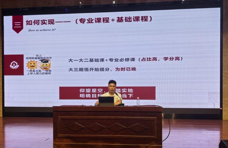 江鉴廷从“大一复盘”、“大二规划”、“如何实现?”、“旧事重提”四个板块带领同学们回顾上一学年同时展望新学年。他分享了关于未来成长规划的多条道路,引导同学们理应趁早规划未来,基于大一期间对自己的认识,选取合适的发展道路,不留遗憾地度过剩下的大学生涯。江鉴廷在“如何实现?”这一板块中讲解了如何通过专业课程与项目实践这两部分辅助完成自身的未来学业规划。在“旧事重提”板块,江鉴廷从交通安全、防范诈骗、上课出勤等多方面向大家强调在日常学习生活中需要注意的事项。