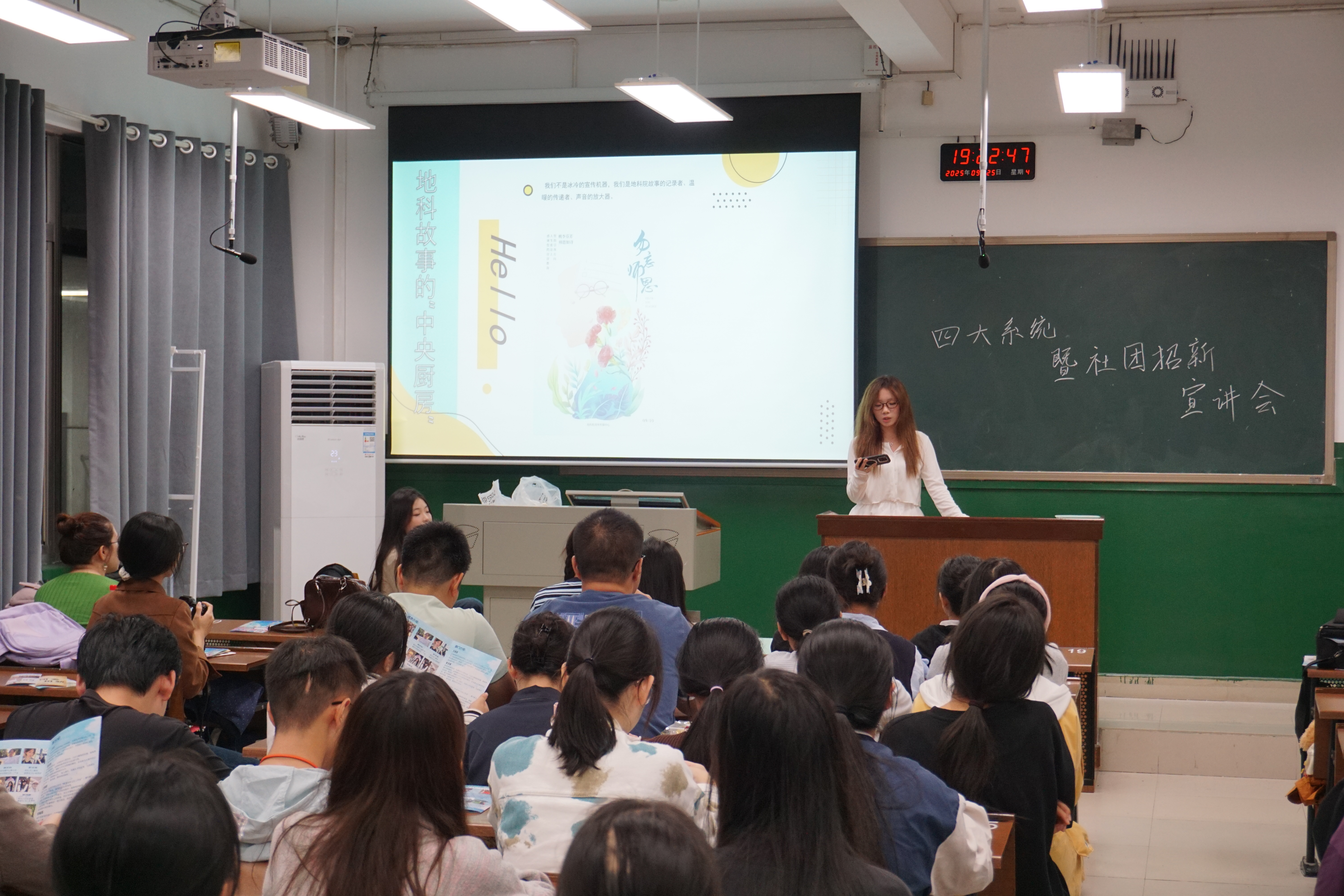 (通讯员 于昕禾)为了帮助25级新生更好了解系统工作和社团任务,地理科学学院(以下简称“地科院”)于9月25日,在南院体育教学楼204举行招新宣讲会,此次会议由团委办公室主任蒋迎乐主持,25级学生代表和相关宣传人员参与会议。