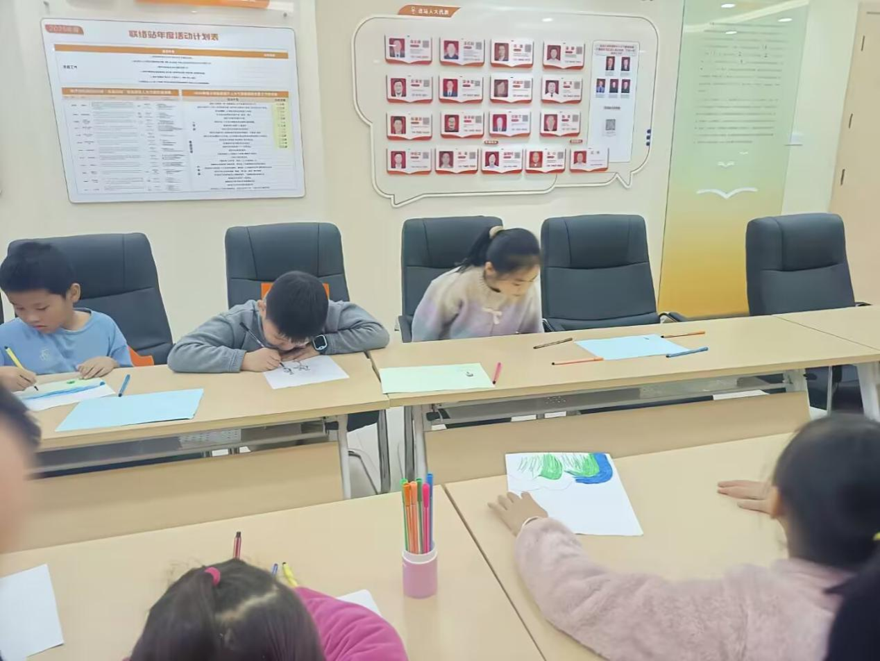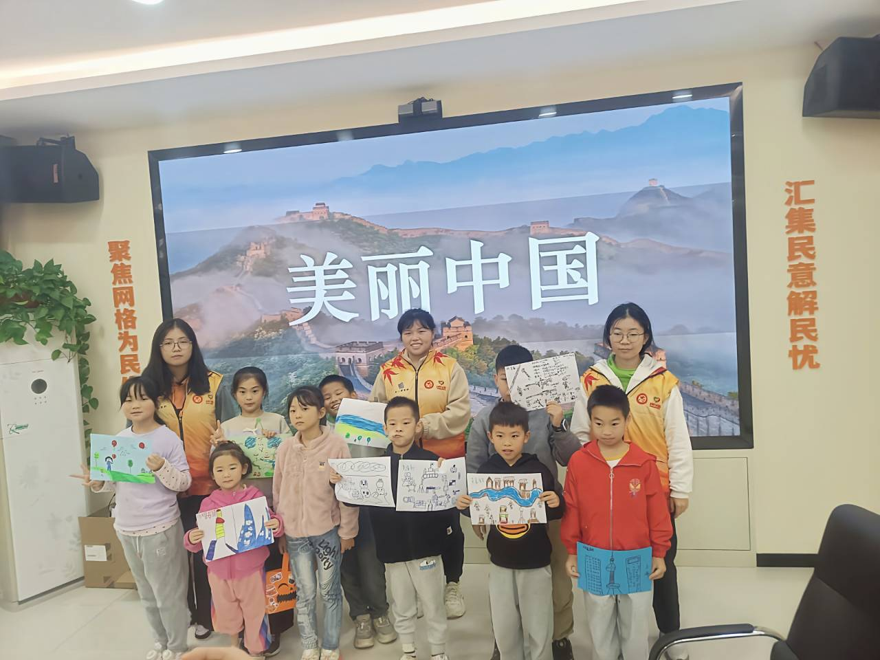 活动开始前,志愿者们提前到场布置好活动场地以便活动有序开展。在小朋友们进行签到并落座后,绘本活动正式开始。主讲人以“中国有多大?”的问题为开端,带领小朋友们逐步探索。志愿者在讲解绘本过程中,穿插了有趣的热场活动“手掌操”来活跃现场氛围;在绘画环节,小朋友们纷纷画下了自己心目的美丽中国,用画笔描绘出了自己对于美丽中国的思考与感悟。活动结束,志愿者与小朋友们合影留念并打扫了场地。
