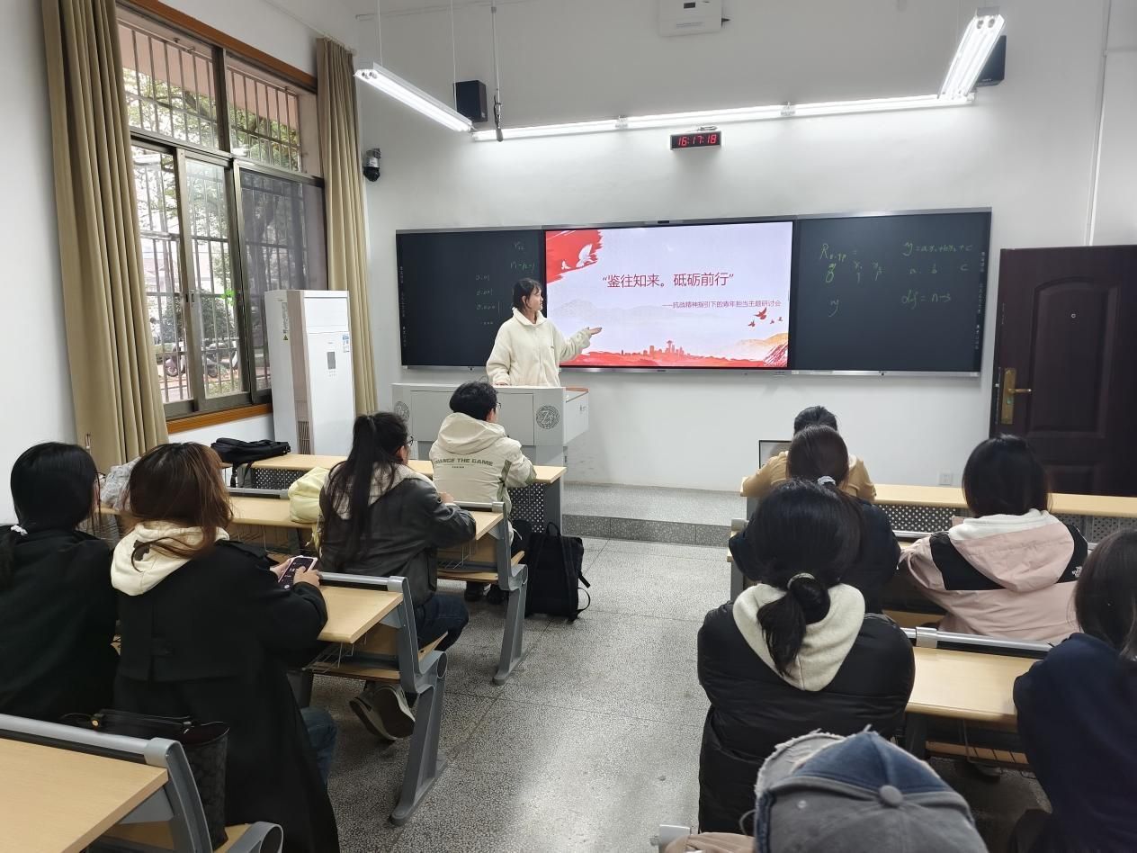 (通讯员 刘诗瑶 何冯威)11月12日下午,地理科学学院(以下简称“地科院”)青马小组第十三组于达美楼104教室举行“鉴往知来,砥砺前行”抗战精神指引下的青年担当主题研讨会。此次活动由组长刘诗瑶主持,旨在通过理论学习与现实生活的结合,加强小组成员担当与使命感,坚定共产主义理想信念。