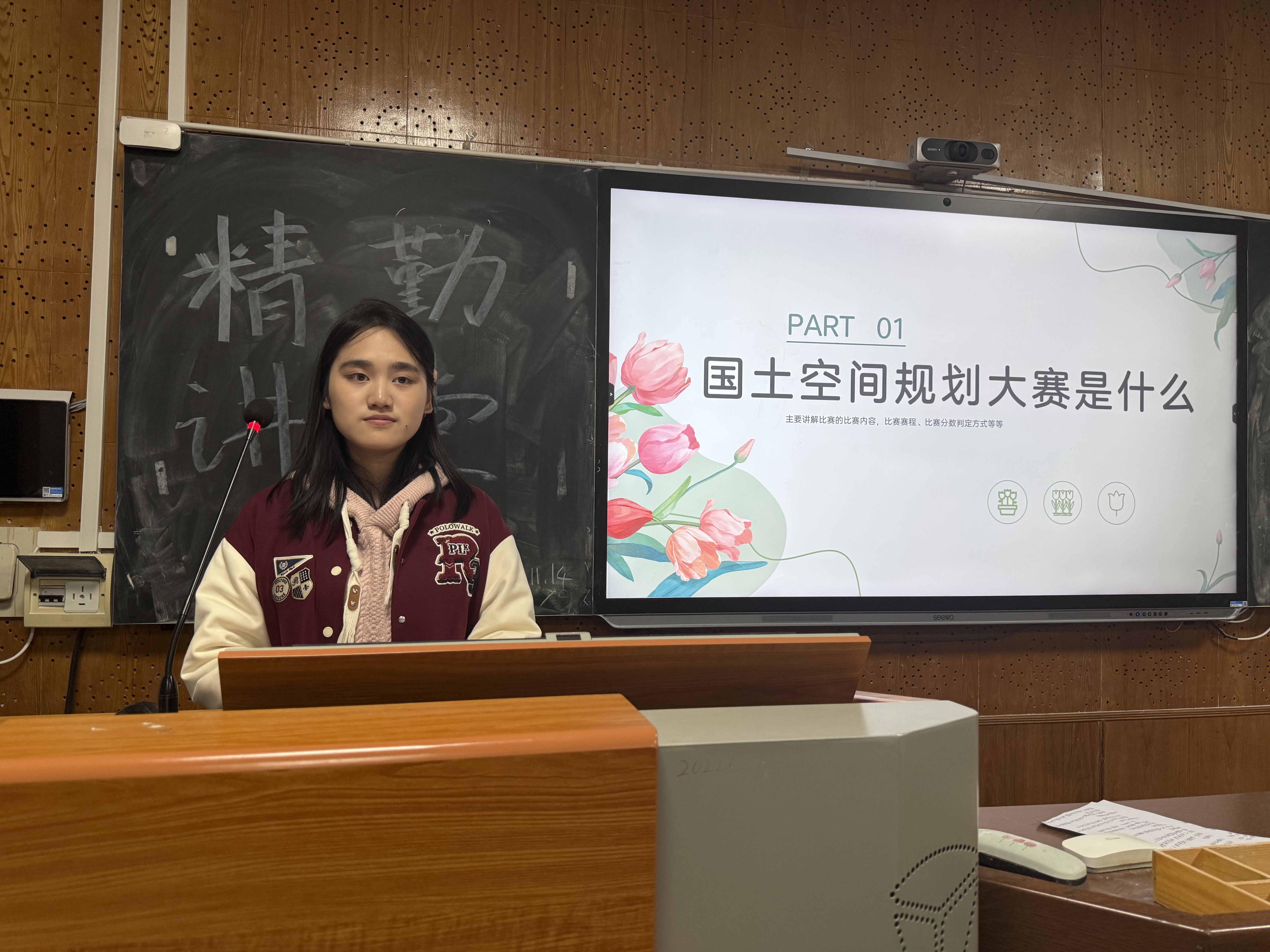 此次活动的主讲人为地科院2023级土地资源管理专业学生吴佳妮。她以国土空间规划大赛为主要案例,从参赛背景、方案设计到成果展示,对竞赛流程进行了系统讲解。结合自身实践经验,吴佳妮分享了参赛过程中所涉及的软件应用、方案思路及团队协作方法,并介绍了土地资源管理专业的相关竞赛类型与参与途径。在互动交流环节中,针对同学们提出的技术操作、问题解决等具体问题,吴佳妮进行了细致解答,为同学们后续参与专业竞赛提供了具有参考价值的建议。