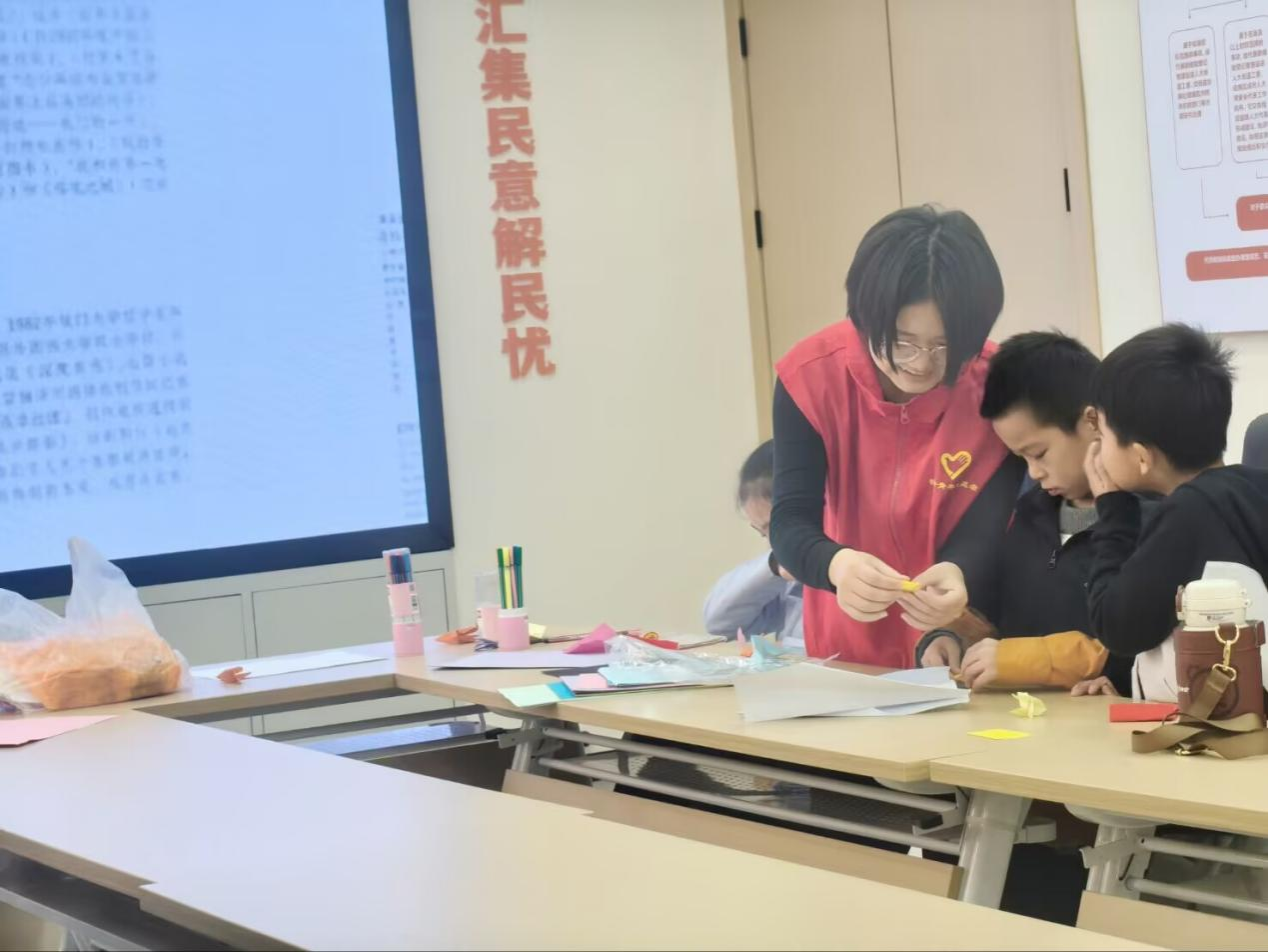 活动开始前,志愿者们提前到场布置好活动场地以便活动有序开展。在小朋友们进行签到并落座后,绘本活动正式开始。主讲人通过对北纬36度线上不同国家日出时间差异的讨论,引发小朋友们对绘本内容的思考。志愿者在讲解绘本过程中,穿插了有趣的热场活动“折折小动物”,小朋友们纷纷选择了自己喜欢的彩纸并折出了自己喜欢的动物,这不仅调动了小朋友们参与的积极性,同时也活跃了现场氛围。活动结束,志愿者与小朋友们合影留念并打扫了场地。