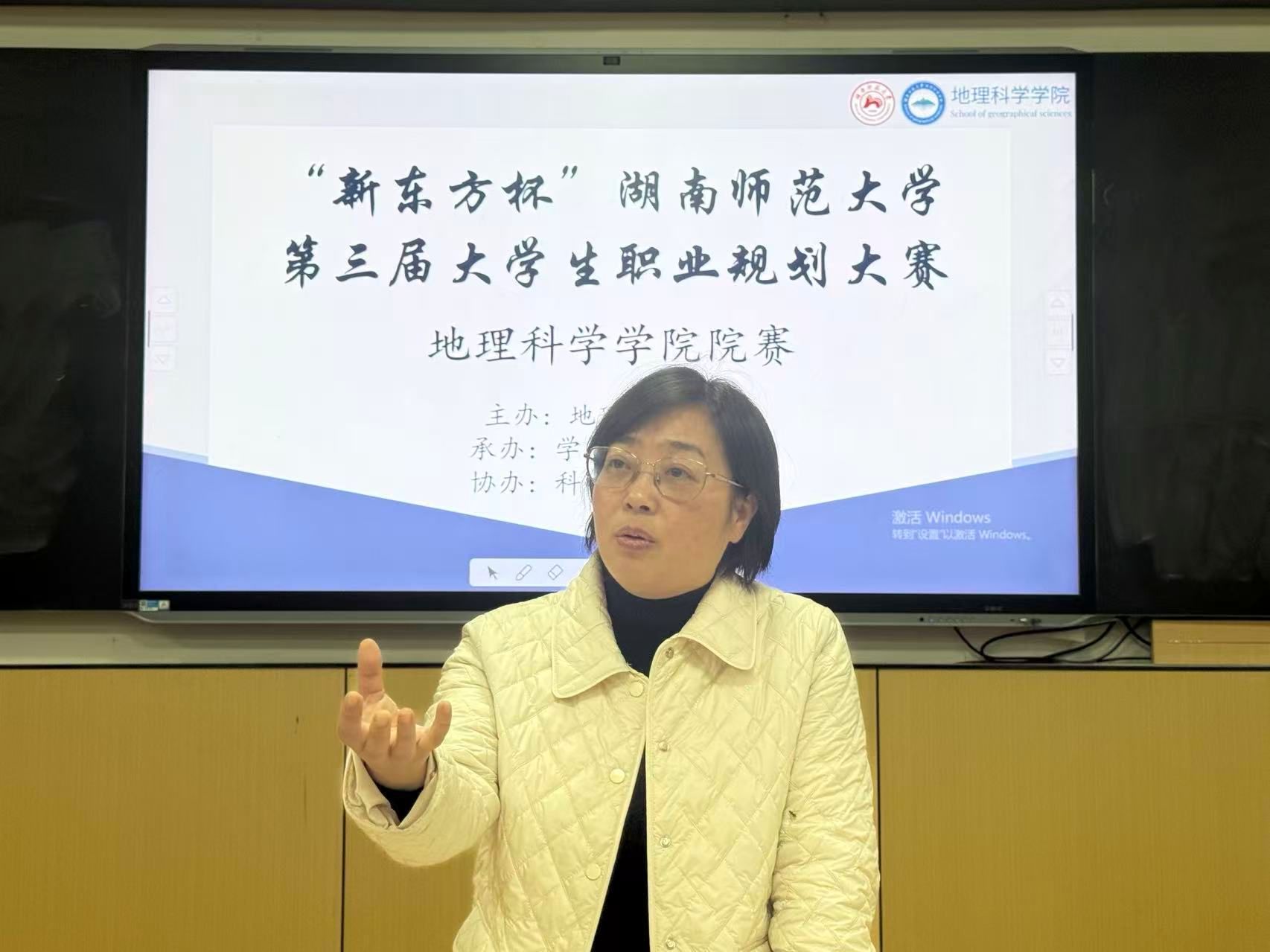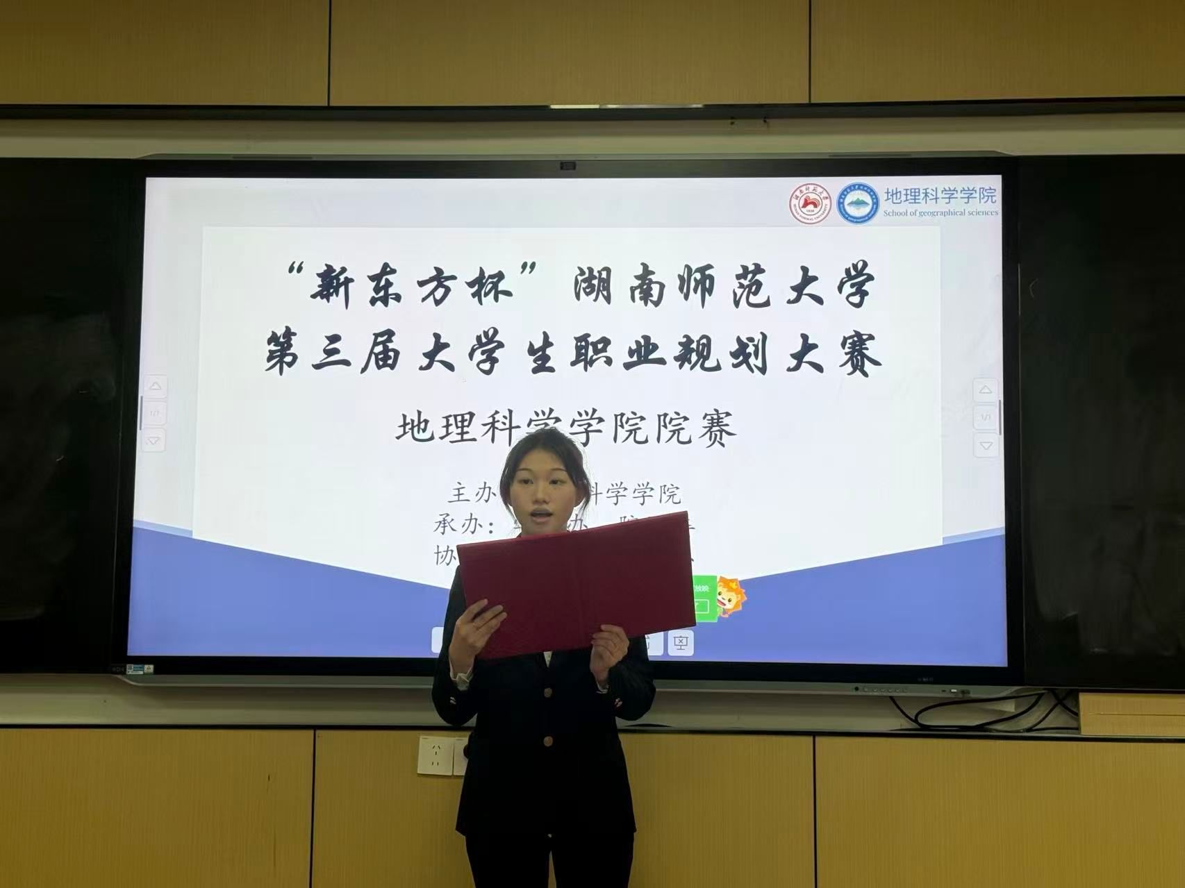 (通讯员 范祎祎 莫添奕)11月19日下午,地理科学学院(以下简称“地科院”)于二里半校区经纬楼302教室举办“新东方杯”第三届大学生职业规划大赛院赛,共10名学生参加此次比赛,并由学院党委副书记陈媛、地科院老师刘泽麟、黄军林、宋友诚及黑马教育俞辰强老师担任评委,2025级地理科学专业学生罗璐主持赛事。