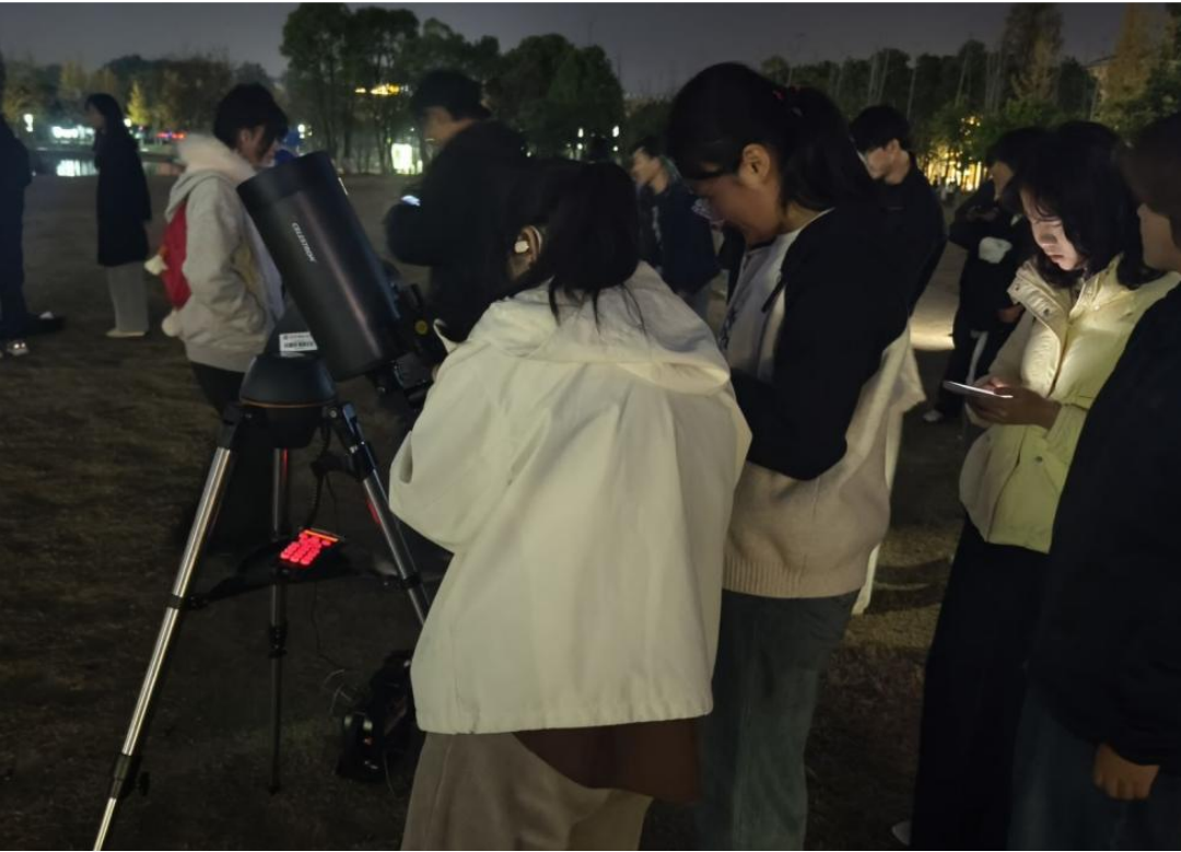 (通讯员 阙思萌 唐思慧)11月30日晚,地理科学学院天文地理协会在后湖公园开展“路边天文”观测科普活动。活动邀请裴禾老师专业指导,借助天文望远镜等工具,带领会员近距离观测月球与土星,沉浸式感受宇宙天体魅力。为保障效果,协会理事提前1小时到场,完成多台望远镜调试校准,并结合天文数据确定最佳观测角度。