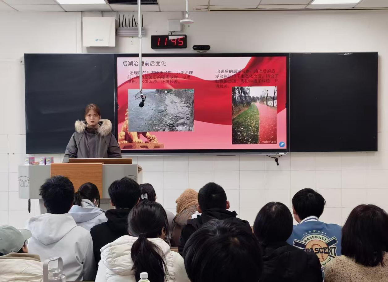 活动伊始,主持人王子彤带领全体成员进行《习近平谈治国理政》第五卷专题学习,以“后湖之变”为例带领大家领悟“中国之治”。小组成员深入研读著作内容,夯实理论根基、把握治国理政的核心要义,通过开展“从‘后湖之变’看‘中国之治’”专题理论学习,剖析后湖从“臭水死湖”到生态艺术园区的蝶变历程,领悟其背后的治理智慧,对新时代“中国之治”的实践伟力和深刻内涵有了更透彻的理解。