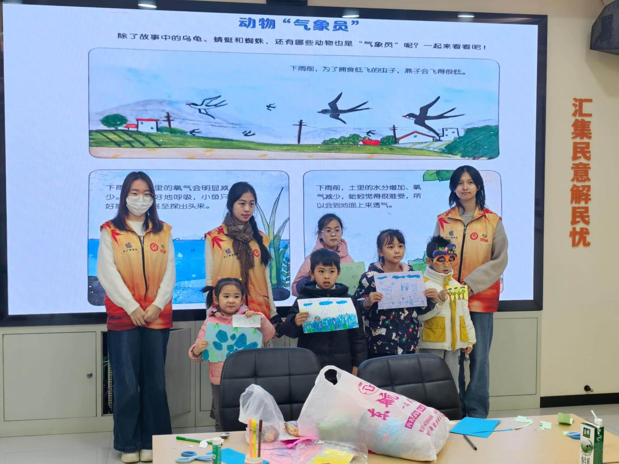 活动伊始,志愿者完成场地布置与物料准备。开场热身游戏“进化论”有效调动了现场气氛。在随后的绘本讲解环节,主讲人聚焦乌龟、蜻蜓、蜘蛛等动物对天气变化的感应行为,系统阐释了其作为自然“气象员”的科学原理,引导小朋友理解生物行为与气象条件之间的关联。讲解结束后,活动进入手工实践环节“小动物的雨天如何度过”。小朋友们在志愿者协助下,通过绘画与手工结合的方式,为选定的小动物制作雨具或设计防雨场景,进一步巩固了绘本所学知识。活动结束后,志愿者与参与儿童合影并完成场地清扫工作。