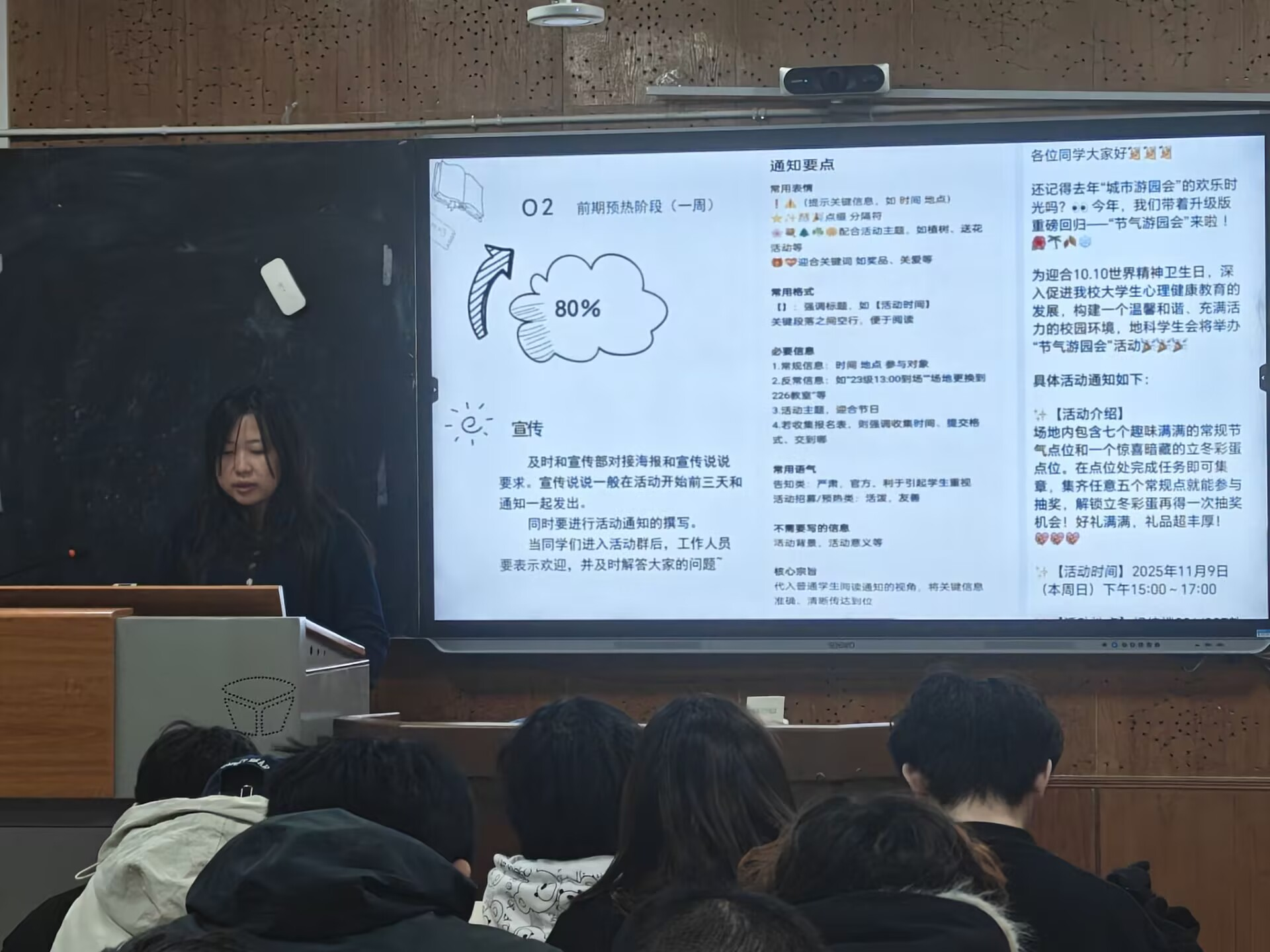此次培训以理论结合实例的方式,清晰呈现策划要点,为地科院学生会成员们提供了可落地的实践指南,强化了团队协作与执行能力,为后续打造优质校园活动奠定坚实基础。
