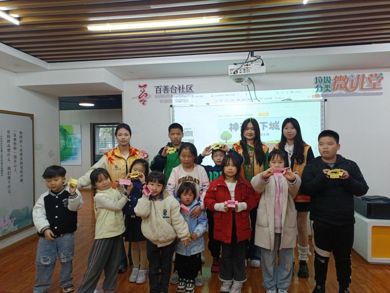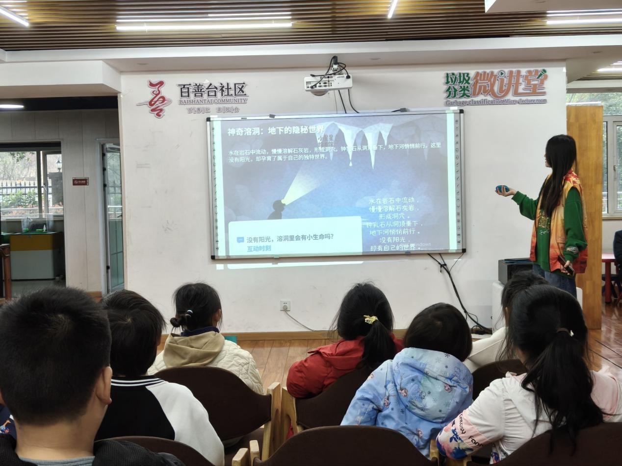 志愿者们提前到场布置好活动场地,并组织小朋友们有序进行签到。热场环节,志愿者设计了藏宝图小游戏,在互动中激发小朋友们对神奇的地下世界的好奇心,进而产生聆听绘本讲解的兴趣。主讲人化身为故事里的挖掘工,带领小朋友们从地表深入地下,学习地表以下不同深度的地质构造与环境特点。绘本讲解结束后,小朋友们在志愿者的协同带领下画出简易的地球切面图,增进对真实地下生态系统和地球内部构造的了解。随后,志愿者将折纸与趣味舞蹈相结合,教小朋友们学习折跳舞的小人。活动结束,志愿者与小朋友们合影留念并打扫了场地。