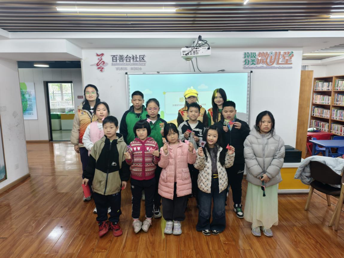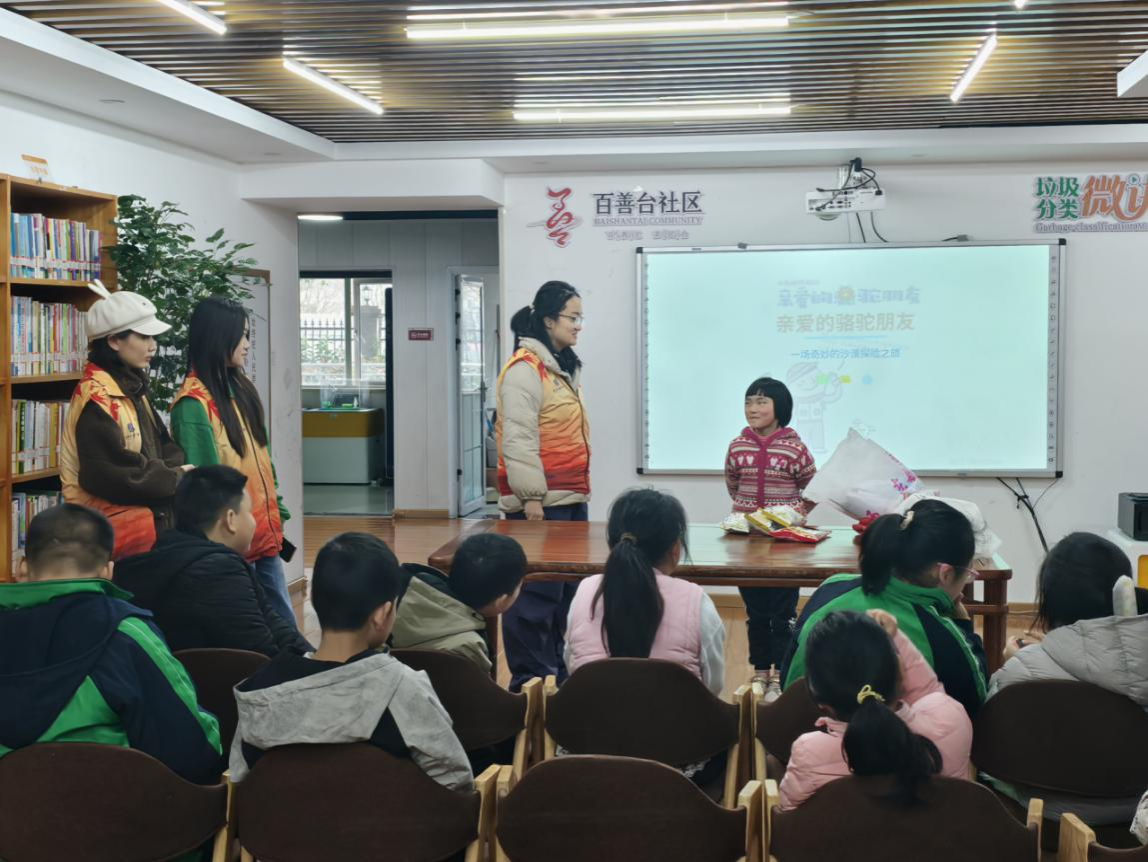 为确保活动有序开展,志愿者提前到场布置好活动场地,并组织小朋友们有序进行签到。志愿者将趣味知识抢答环节作为热场活动,在互动中引导小朋友们树立保护环境的观念,并激发其探索地理知识的热情。主讲人生动讲述绘本,以此为载体引出骆驼的生活习性和沙漠的气候特点。随后,志愿者带领小朋友们学习折纸小兔子,以寓教于乐的形式,引导小朋友们发挥想象力,画出自己心中的沙漠。在欢声笑语中,志愿者教育小朋友们应该节约水资源、保护地球环境。活动结束,志愿者与小朋友们合影留念并打扫了场地。