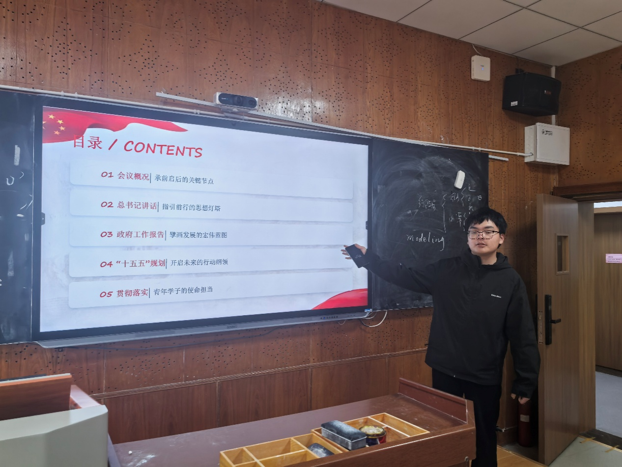 活动伊始,小组成员共同学习“十五五”规划的重要内容。谷星宇借助ppt对2026年全国两会的重要历史意义与核心成果进行梳理,重点解读了习近平总书记在两会期间的重要讲话以及政府工作报告中关于青年发展的内容。小组成员认真听讲并做好笔记。在主题探讨环节,小组成员围绕“青年学子如何理践行两会精神”这一主题展开讨论,并结合自身经历交流心得。