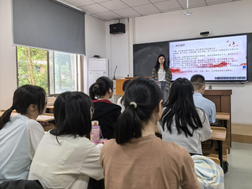 组长叶宇浩首先向全体成员展示了2026年全国两会的要点,围绕政府工作报告中的民生保障、教育发展、社会保障等群众关切的问题展开交流,阐释了各项政策背后所蕴含着的民生温度和为人民服务的发展初心,让组员们体悟到两会对民生问题的高度关切。随后,小组成员进行互动交流,现场学习氛围浓烈。