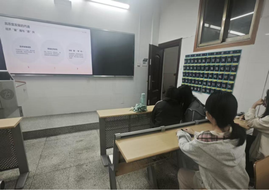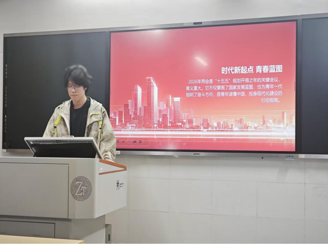 活动伊始,组长张航以两会中心内容“十五五”规划为切入点,讲述“五个坚持”宝贵经验和高质量发展经济“量”增与“质”升的内涵,并说明2026年政府工作报告和民生福祉保障工作,最后落实到当代青年的使命与担当。
